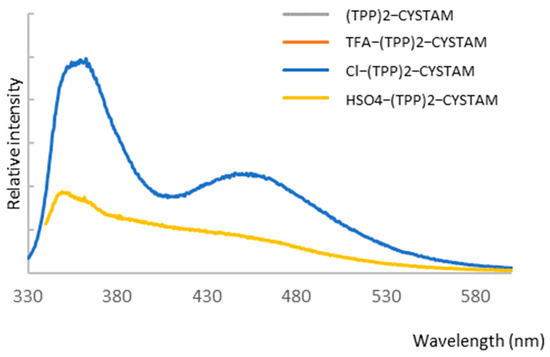 The fluorescent properties of bisquaternary ammonium compound and its adducts with TFA−, Cl− and HSO4− were studied. Two different concentrations of (TPP)2-CYSTAM—1.37 × 10−4 M and 1.37 × 10−5 M were examined (Figure 8). The amount of added acids was, respectively, 1.31 × 10−2, 1.31 × 10−3 M in the case of TFA adduct, 3.24 × 10−5, 3.24 × 10−6 mole in the case of Cl-adduct and 1.87 × 10−5 and 1.87 × 10−6 mole in the case of HSO4-adduct.