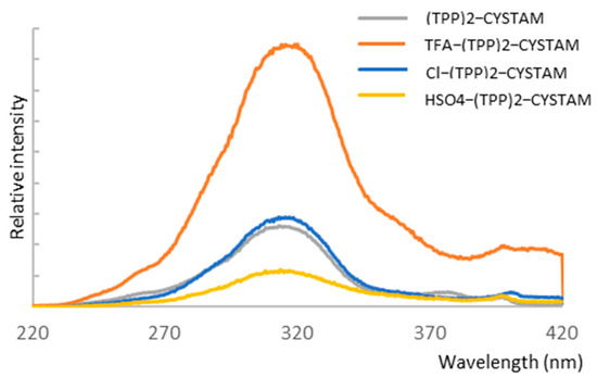 The absorption spectrum of TPP reveals a broad asymmetric band in the range 280–380 nm with a maximum at 310 nm (Figure 7) corresponding to the 1π*←1π transition of intramolecular charge transfer (ICT) nature from phenyl substituents on the heteroring [45]. The formation of adducts causes a change in intensity as well as the appearance of an additional weak band in the range 380–450 nm centered at 404 nm (Figure 7). The intensity of the additional band is highest for Cl-(TPP)2-CYSTAM. A pronounced hyperchromic effect is observed for the TFA-(TPP)2-CYSTAM adduct; the molar absorption coefficient increases from 1.40 × 104 for (TPP)2-CYSTAM to 1.93 × 104 for TFA-(TPP)2-CYSTAM. A hypochromic effect occurs for HSO4-(TPP)2-CYSTAM, with the extent of the change in the molar absorption coefficient being slightly smaller than for TFA-(TPP)2-CYSTAM. In contrast, a very weak hypochromic effect is observed for the adduct with the Cl− ion. Changes in the intensity of the absorption bands for adducts as well as the appearance of bands in the lower energy range are the result of ion–TPP interactions. The strength and types of interactions as well as the nature of the anions are responsible for the magnitude of the observed changes.
