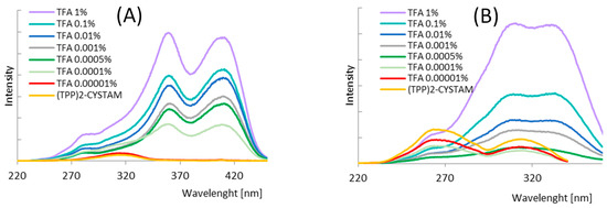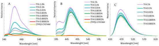 An analogous detection range can be obtained by exciting samples with a wavelength of 358 nm. This wavelength lies at the end of the range of the free (TPP)2-CYSTAM excitation band and at the slope of the TFA-(TPP)2-CYSTAM adduct excitation band. In this case, there is an increase in signal intensity for 0.00001% TFA, and then a sharp increase in emission intensity with a change in profile for 0.0001% TFA, as demonstrated in Figure 14B.