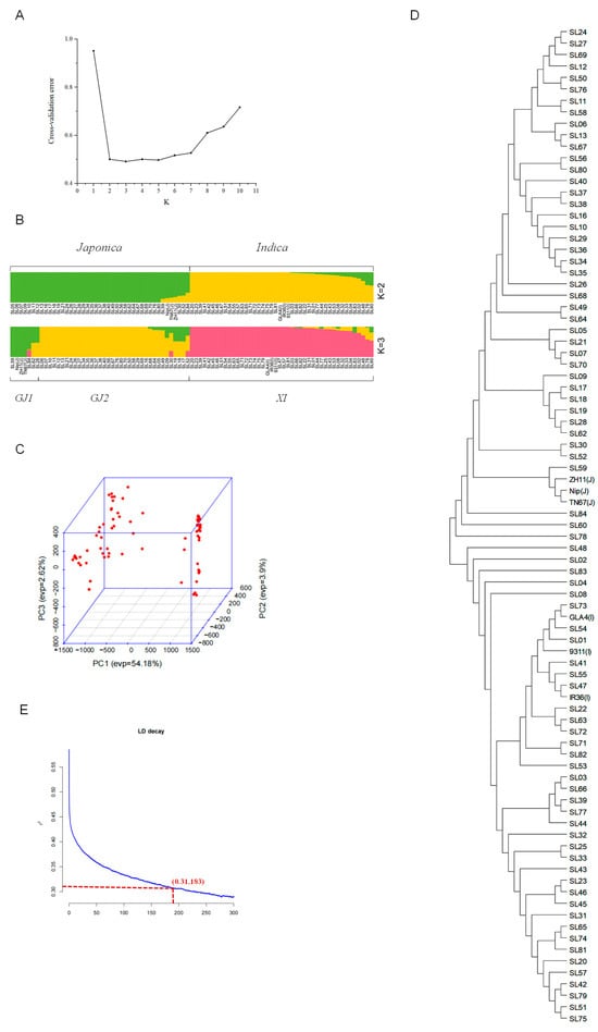 Population structure and genetic diversity in 90 rice germplasms. (A) Cross-validation error for K= 2–10 from ADMIXTURE analysis showing that the panel had 3 groups. (B) Population structure plot (K = 2, 3). (C) PCA plot of the first three principal components. (D) Phylogenetic tree based on genetic distance. (E) Genome-wide average LD map of all accessions.
