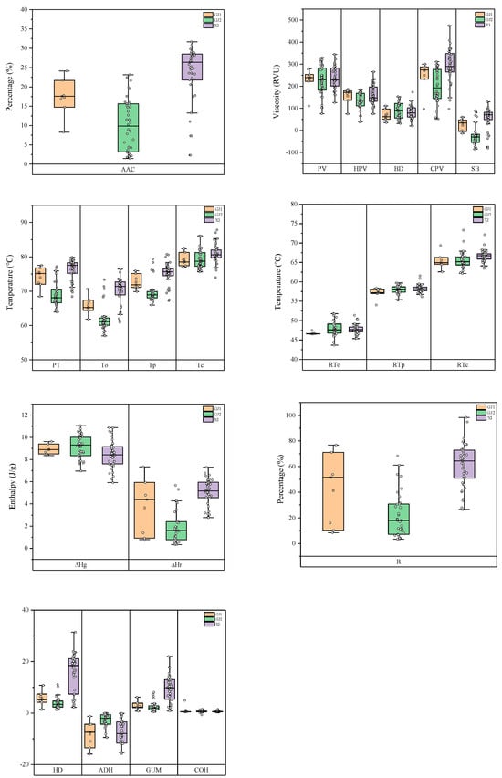Previous research has reported significant correlations between AAC and various pasting viscosity parameters []. Our findings align with these results, as we observed a correlation between AAC and most pasting viscosity parameters. Additionally, previous studies have shown positive correlations between AAC and HD, CHEW, GUM, and COH, as well as a negative correlation with ADH [,], which is consistent with our findings. Hori et al. [] found significant positive correlations between HD and PV, HPV, CPV, SB, and PT, as well as significant negative correlations between ADH and CPV, SB, and PT. Our results also demonstrate similar significant correlations. Although some correlations vary across different studies, likely due to the diversity of rice germplasms or various environmental conditions, our findings generally align with previous research. The consistent correlations between AAC, paste properties, and textural attributes may be attributed to their physicochemical and even genetic relationships. These relationships can be exploited by rice breeders in advanced breeding generations for trait selection.