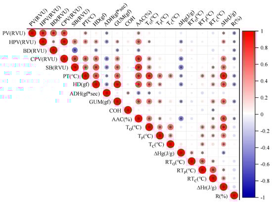 The pair-wise correlation coefficients for each pair of the 20 traits are presented in Figure 3. Notably, AAC demonstrated significant correlations with all traits except COH, RTo (retrogradation onset temperature), and RTp (retrogradation peak temperature). Specifically, AAC exhibited negative correlations with BD, ADH, and ∆Hg, while positive correlations were found between AAC and HPV, CPV, SB, HD, GUM, ∆Hr, and R%. Among the pasting viscosity parameters, the majority of pairs displayed correlations, with only three pairs lacking statistical significance. Additionally, PT had a significant correlation with most thermal parameters and retrogradation properties.