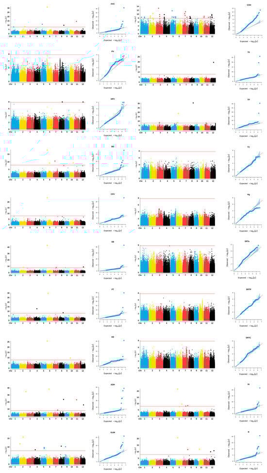 Manhattan (left) and quantile–quantile plots (right) of the genome-wide association study for quality traits of rice accessions. The points in the Manhattan plots indicate the −log10(p) values. The horizontal red line indicates the significant thresholds.