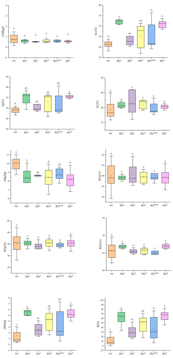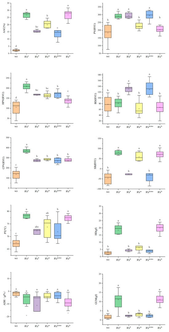 The distributions of quality traits in six panels, wx panel, Wxa panel, Wxb panel, Wxin panel, Wxla/mw panel, and Wxlv panel. Different letters indicate significant differences among means (p < 0.05).