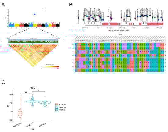 Identification of candidate genes for Tp in the whole panel. (A) High-density gene-based association analysis and LD heat map of local Manhattan map, around the peak on chromosome 6 highlighted with a blue triangle. (B) Based on 43 SNPs in all evaluated rice accessions, 8 haplotypes of SSIIa (LOC_Os06g12450) were identified. In the gene structure diagram of LOC_Os06g12450, the exon and UTR are indicated by the red frame; and the intron and intergenic regions are marked by black lines. (C) Comparison of Tp among accessions carrying different haplotypes of SSIIa, and haplotypes with fewer than 5 accessions are not shown. * and *** indicate correlations are significant at p < 0.05 and p < 0.001, respectively.