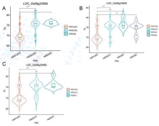 Haplotype analysis was conducted on three genes (LOC_Os08g33590 (A), LOC_Os08g33650 (B), LOC_Os08g33680 (C)) that harbored nonsynonymous SNPs and UTR SNPs significantly associated with Tp. ** and *** indicate correlations are significant at p < 0.01 and p < 0.001, respectively.