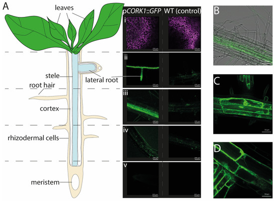 (A) The cartoon depicts root developmental regions and, in parallel, representative fluorescence images from pCORK1::GFP expression in 14-day-old transgenic Arabidopsis seedlings, in comparison to the wild-type (control) seedlings. The promoter activity was not detectable in the aerial parts of the plant (i). The roots exhibit tissue-specific CORK1 expression patterns. A high GFP fluorescence is observed in the lateral roots (ii), root stele (iii), and cortical tissue while barely any fluorescence can be detected in the rhizodermal cells layer (iv). No fluorescence was found in the meristematic zone and root tip (v). (B) Confocal microscopy of 14-day-old transgenic Arabidopsis seedlings illustrates GFP fluorescence driven by the CORK1 promoter in the early root differentiation zone. (C,D) These panels show the subcellular location of the GFP fluorescence in the cytoplasm. Representative results were observed for six plants from three independent transformants.