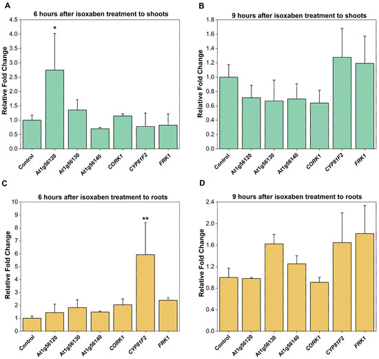 Expression of receptor kinase genes in 14-day-old Col-0 plants determined by qRT-PCR after application of 0.6 µM ISX to the roots. Shoots (A,B) and roots (C,D) were separately harvested 6 h (A,C) or 9 h (B,D) after ISX application. FRK1 (encoding FLG22-INDUCED RECEPTOR-LIKE KINASE1, At2g19190) and CYP81F2 (encoding a P450 enzyme involved in glucosinolate metabolism, At5g57220) are immune marker genes and were used as controls. Depicted is the fold change in expression relative to the DMSO control without ISX. Error bars represent the standard error of three biological replicates. Asterisks indicate a statistically significant difference relative to the control as determined by one-way ANOVA followed by a Holm–Sidak post-hoc test (* p ≤ 0.05; ** p ≤ 0.01).