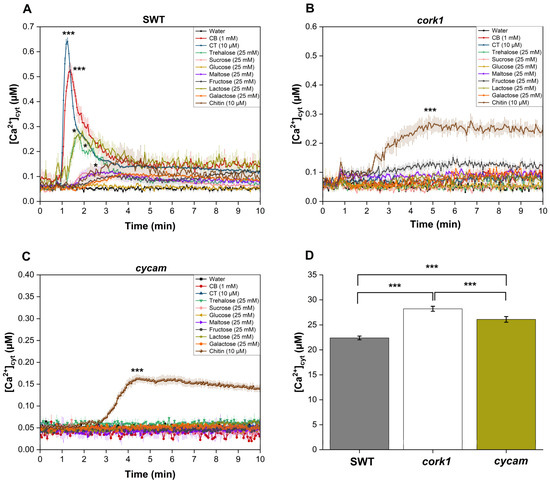 [Ca2+]cyt elevation in the roots of 14-day-old segregating wild-type (SWT) (A) and cork1 (B) seedlings expressing aequorin after application of different sugars. [Ca2+]cyt elevation was observed after application of CT (10 µM), CB (1 mM), and trehalose or lactose (25 mM each) in the SWT but not in the cork1 and cycam (C) mutants. Chitin (10 µM) was used as a control and the cork1 and cycam mutations did not affect its response. (D) Comparison of the total [Ca2+]cyt levels (area under the curve) upon chitin application to the roots of SWT, cork1, and cycam seedlings. Total [Ca2+]cyt levels were significantly higher in cork1 compared to SWT and cycam. Error bars represent the standard error from eight seedlings. Data are based on three independent experiments. Statistical significance at the peak value was determined by Tukey’s HSD test (* p ≤0.05; *** p ≤ 0.001). Asterisks indicate significant differences compared to the water treatment (A–C).