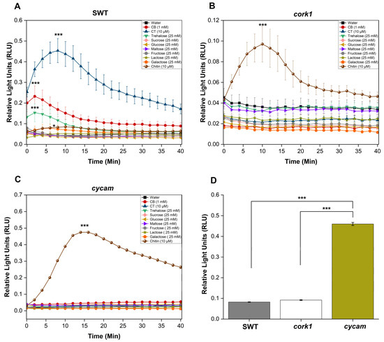 The cork1 and cycam mutants failed to induce ROS production after the application of different sugars. CT (10 µM), CB (1 mM), or trehalose (25 mM) trigger ROS production in the root tissue of the segregating wild-type (SWT) (A) but not in the cork1 (B) and cycam (C) seedlings. ROS production after the application of chitin was not affected by the mutations. (D) Comparison of the maximum ROS production in response to chitin application at the peak time in the roots of SWT, cork1, and cycam seedlings. ROS production was significantly higher in cycam roots compared to SWT and cork1 roots. Error bars represent SE from eight seedlings for each treatment. Statistically significant differences between CT, CB, trehalose, and chitin versus water treatment at the peak value were determined by Tukey’s HSD (* p ≤ 0.05; *** p < 0.001). The experiment was repeated three times with similar results.