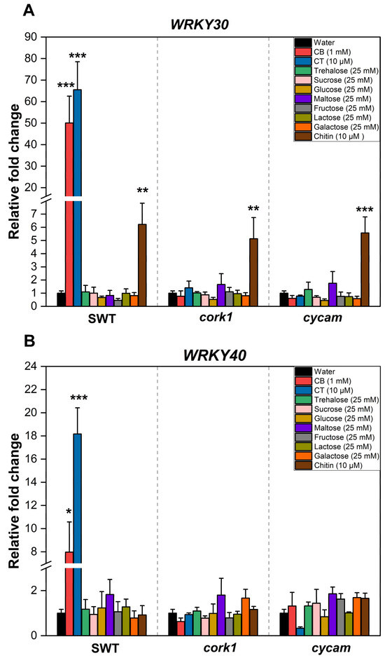 Upregulation of (A) WRKY30 and (B) WRKY40 mRNA levels in the roots was impaired in cork1 and cycam mutants upon treatment with either 10 μM CT or 1 mM CB for one hour, but not in the segregating wild-type. The expression of WRKY30 was not affected by these mutations upon application of 10 µM chitin. Values were normalized to water treatment on the same genotype. Error bars represent SE from three independent biological replicates, each with twenty seedlings. Statistical significance between water and other treatments within the same genotype was accessed by one-way ANOVA and Tukey’s HSD. Asterisks indicate statistically significant differences between water treatment and treatment with the indicated chemical within the same genotype (* p ≤ 0.05; ** p ≤ 0.01; *** p ≤ 0.001).