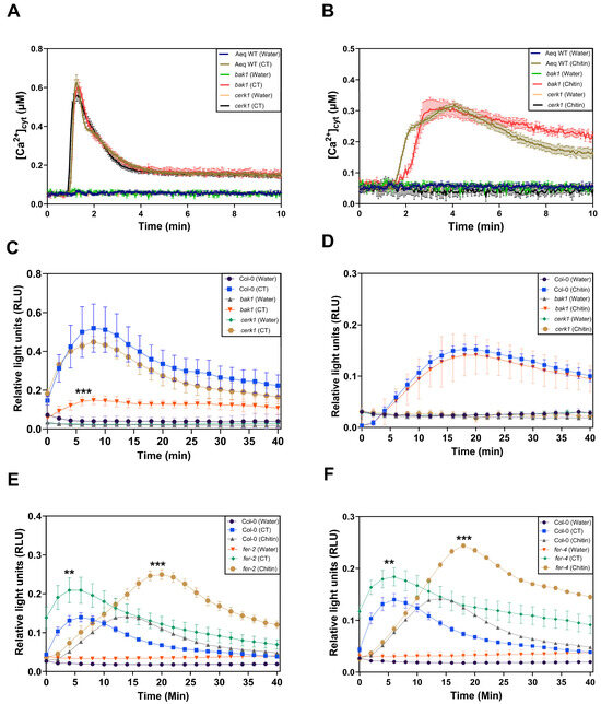 The application of CT to Arabidopsis roots leads to the rapid phosphorylation of BAK1, and the response requires CORK1 [5]. Since BAK1 is a coreceptor of many PRRs (cf. Section 1), we tested whether BAK1 is involved in CT-induced [Ca2+]cyt elevation or ROS production in Arabidopsis roots. We compared CT-induced responses in wild-type and bak1 roots (Figure 6A–D). Chitin was used as a control. [Ca2+]cyt elevation in response to CT or chitin application was not affected by the bak1 mutation (Figure 6A,B), while ROS production was significantly lower after CT application, but not chitin application, to the bak1 mutant, when compared to the wild-type and cerk1 roots (Figure 6C,D). This indicates that BAK1 affects CT-, but not chitin-induced ROS production, while [Ca2+]cyt elevation in response to both D/PAMPs is not affected by BAK1. CT-induced [Ca2+]cyt elevation and ROS production are not affected in the cerk1 mutant (Figure 6A,C).