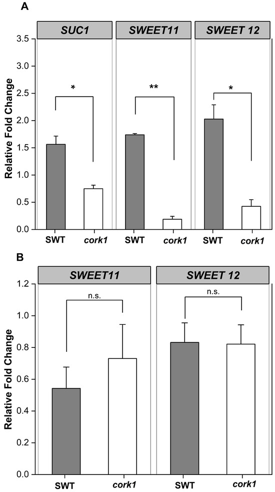 Sucrose (A), but not glucose (B), stimulates the expression of the sugar transporter genes SUC1, SWEET 11, and SWEET 12 in the roots of the segregating wild-type seedlings, but not in the cork1 mutant seedlings, 1 h after sugar application. Values were normalized to water treatment on the same genotype. Error bars represent SE from at least three independent biological replicates, each with twenty seedlings. Statistical significance was determined by a two-tailed Student’s t-test (n.s., no significant differences, * p ≤ 0.05; ** p ≤ 0.01). Regulation of SUC1 by glucose was omitted because SUC1 transports only sucrose.