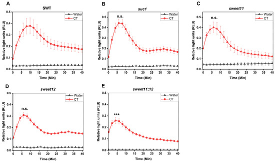 2.9. SUC1, SWEET11, and SWEET12 Control CT-Induced ROS Production and WRKY30/40 Expression