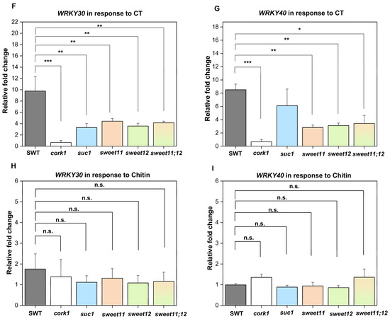 To test whether CT-induced responses are dependent on the sugar transporters SUC1, SWEET11, and SWEET12, we compared ROS production as well as WRKY30/40 gene expression in SWT seedlings and suc1, sweet11, sweet12, and sweet11;12 double knock-out lines. Figure 8A–E demonstrates that ROS production in response to CT application in the sweet11;12 double knock-out line was significantly reduced compared to the wild-type and all single knock-out lines. Furthermore, stimulation of WRKY30 and WRKY40 expression by CT was significantly inhibited in all sugar mutants, while no significant differences were observed for their regulation in response to chitin (Figure 8F–I). This demonstrates that knocking out these sugar transporters represses CT-induced WRKY30/40 expression, while ROS production is less affected in the sugar transporter mutants. In conclusion, Figure 7 and Figure 8 demonstrate that CT/CORK1 influences the expression of sugar transporter genes and sugar transporters influence CT/CORK1-induced responses.