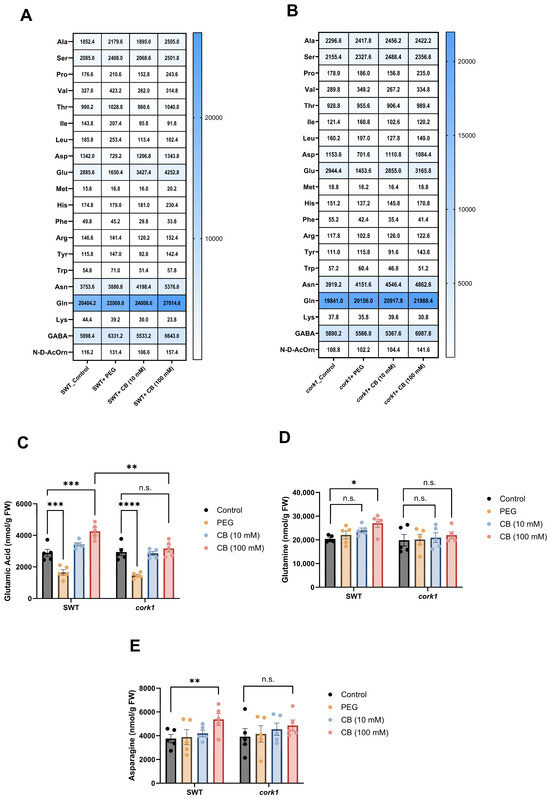 Effect of CB treatment (for 6 h) on amino acid levels (nmol/g FW) in the roots of segregating wild-type (SWT)and cork1 seedlings. The heatmap displays a quantitative analysis of amino acids in the roots of SWT (A) and cork1 (B) seedlings with or without CB. The SWT and cork1 plants were pre-grown on half Murashige and Skoog media and then transferred to plant nutrient media (PNM) with different treatments (no treatment as control; 10 mM CB; 100 mM CB; 15 mM PEG 6000) for 6 h. PEG was used to eliminate the effect of osmotic shock. Amino acids were measured in 14-day-old plants (FW, fresh weight). The content of glutamic acid (C), glutamine (D), and asparagine (E) in the roots of the SWT and cork1 after exposing them to 10 or 100 mM of CB for 6 h, is shown. Statistical significance was tested with two-way ANOVA using Tukey’s multiple comparison test (* p < 0.05; ** p < 0.01; *** p < 0.001; **** p < 0.0001; n.s., not significant). The data show the means from five independent experiments (n = 48–60 plants per treatment). Error bars represent SEM.