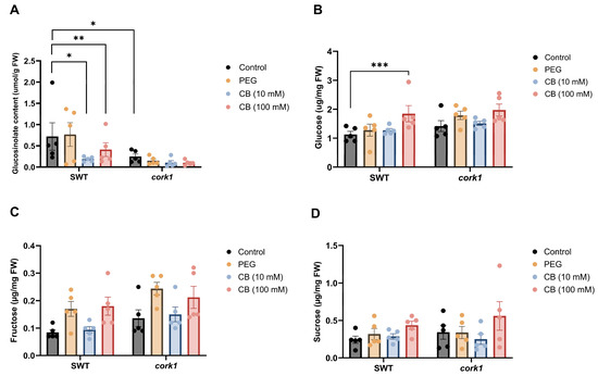 While no significant differences were observed in the fructose and sucrose levels in the CB-treated or untreated SWT and cork1 roots (Figure 10C,D), the glucose level was significantly higher in the SWT roots than in the cork1 roots upon 100 mM CB treatment (Figure 10B).