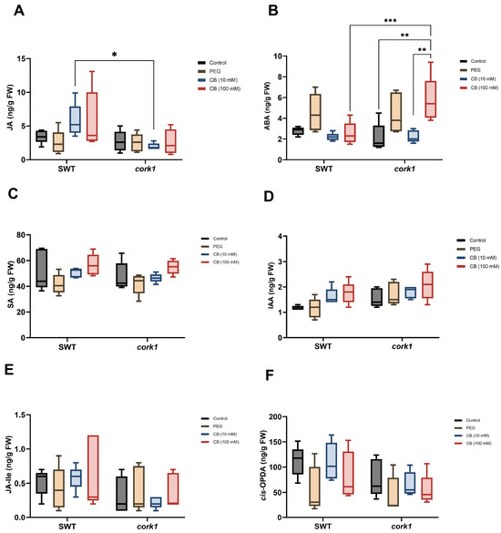 Phytohormone levels (ng/g FW) in the segregating wild-type (SWT) and cork1 roots 6 h after treatment with 10 or 100 mM CB. The amounts of (A) JA, (B) ABA, (C) SA (salicylic acid), (D) IAA (indole-acetic acid), (E) the JA bioactive form JA-lle (JA-isoleucine), and (F) the JA precursor, cis-OPDA (cis-(+)-12-oxo-phytodienoic acid), were measured in the roots of 14-day-old Arabidopsis plants (FW, fresh weight). The SWT and cork1 plants were pre-grown on half Murashige and Skoog media and then transferred to plant nutrient media (PNM) for 6 h with different treatments (no treatment as control; 10 mM CB; 100 mM CB; 15 mM PEG 6000). PEG was used to eliminate the effect of osmotic shock. Asterisks represent significant differences between treatments according to two-way ANOVA with Tukey’s multiple comparison test (* p < 0.05; ** p < 0.01; *** p < 0.001). The data show the means (±SE) of five replicates, each of which consisted of 48–60 seedlings.