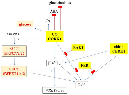 SUC1 is highly expressed in roots, and its expression profile under different conditions suggests that the protein is involved in the uptake of sucrose, unloaded from the phloem, into growing root cells with no symplastic connection [72,73]. The stimulation of SUC1 expression by sucrose is CORK1-dependent, and the inactivation of CORK1 represses SUC1 expression (Figure 7). These effects are even stronger for the SWEET11 and SWEET12 genes. SWEET11 and SWEET12 transport predominantly hexoses or sucrose, and pathogens induce SWEET genes to promote secretion of sucrose into the cell wall space, where it is used as an energy source after cleavage by cell wall invertases [35]. The downregulation of sucrose-induced SWEET gene expression in the cork1 mutant lowers the apoplastic sugar level. Since less sugar is in the apoplast, SUC1 is less required for sucrose translocation from the apoplast into the root cells. Higher cellular sugar levels might promote the primary sugar metabolism in the cell. Although this requires further investigation, it is obvious that CORK1 interferes with the sugar (sucrose) transport in Arabidopsis roots (Figure 12).