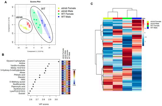 2.3. Global Comparison Using PLS-DA and Hierarchical Clustering Differentiate the Effects of Obesity and Sex