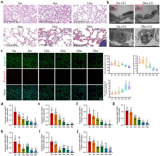 The structure of the alveolar epithelium of the lung tissues was assessed using an HE staining kit (G1120, Solarbio, Beijing, China). The lung tissue sections were subjected to staining according to the manufacturer’s instructions. Each age group consisted of six biological replicates. Finally, the sections were examined under a bright-field microscope (DM6B, Leica, Wetzlar, Germany) using a 20× objective lens.