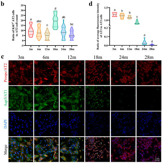 Lung tissues from 3 m and 24 m mice were enzymatically digested to produce lung cell suspensions, followed by subsequent staining procedures. Within a 500 μL volume of cell suspension, 1 μL of FITC rat anti-mouse CD45 antibody (BD, 553079), PE/Cyanine 7 anti-mouse CD31 antibody (102418, Biolegend, San Diego, CA, USA), APC CD326 (EpCAM) monoclonal antibody (17-5791-80, Invitrogen, Carlsbad, CA, USA), and APC/Cyanine 7 anti-mouse MHCII (I-A/I-E) antibody (107627, Biolegend, San Diego, CA, USA) were added. The cells were then incubated on ice in the absence of light for 30 min for optimal labeling. Subsequently, 5 μL of 7-AAD viability staining solution (420404, Biolegend, San Diego, CA, USA) was added to facilitate the selection of viable cells. Ultimately, the cells underwent a flow cytometry analysis (FACSAriaTM III Cell Sorter, BD, Franklin Lake, NJ, USA) to identify and isolate CD45− CD31− CD326+ MHCII+ cells, specifically sorted as AT2 cells.