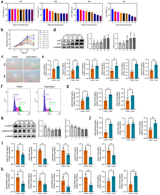 In this experiment, we utilized a Cell Counting Kit-8 (CCK-8, CK04, Dojindo, Kyushu Island, Japan) according to the provided instructions. After a certain period of D-galactose-induced senescence in the A549 cells, 10 μL of CCK-8 solution was added, and the cells were incubated at 37 °C in a light-protected, constant-temperature chamber for 60 min. Absorbance at 450 nm was measured using a multi-mode microplate reader (SYNERGYTM HTX, BioTek Instruments, Inc., Winooski, VT, USA). Cell viability (%) was calculated as [(%Treatment − %Blank)/(%Control − %Blank)] × 100%. Each group comprised 6 technical replicates.