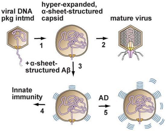 The disease model deduced from diverse data, as described here. (1) DNA enters the capsid of either a phage (phage T3 is used as an example) or a herpesvirus. Hyper-expansion, with subunit conversion to an α-sheet structure, occurs to accelerate DNA packaging when packaging is slowed (proposed details in [,]). (2) In the case of a phage, packaging finishes and a tail is added to the capsid to form a mature phage particle. (3,4) In the case of herpesviruses, amyloid proteins block the progression of the hyper-expanded capsids by converting to an α-sheet structure and then co-assembling with the α-sheet of subunits of the capsid. (5) Alzheimer’s disease is initiated by the over-production of amyloid protein α-sheets, which are toxic. Some amyloid protein α-sheets are subsequently converted to the β-sheet amyloid protein of plaques. However, this conversion is not sufficient to avoid toxicity when Alzheimer’s disease is present (image adapted from []).