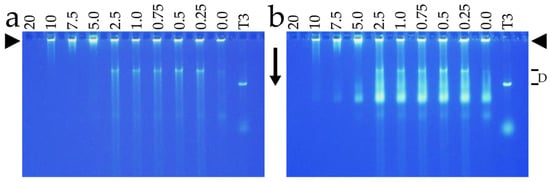 The following was observed after attempts to load phage T4 with MB and subsequent analysis by (1) AGE/GelStar staining (Figure 2a; MB concentration [mM] is above a lane) and then by (2) GelStar staining of the same gel after expulsion of DNA from phage capsids (Figure 2b). A band of phage T4 was seen only in Figure 2b, as expected. However, as MB concentration was increased above 2.5 mM, the band of phage T4 was progressively lost, in contrast to previous results [] with bleomycin. At 5 mM MB, some lost phage band intensity was at the origin in Figure 2a, i.e., before the phage DNA was expelled for Figure 2b. This observation is explained by the MB permeabilization to GelStar of phages that were at the origin because of aggregation. The aggregates were apparently too large to enter the gel.