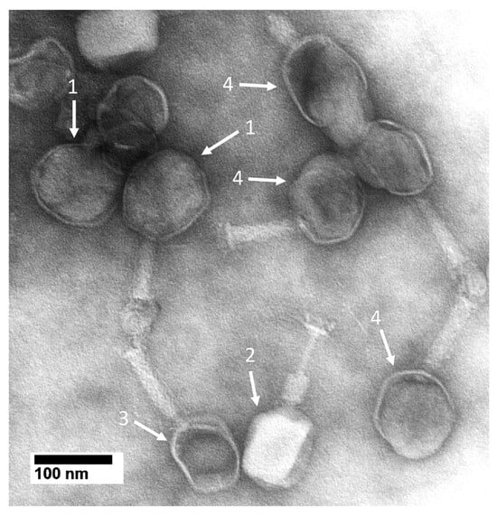 The aggregates had primarily bacteriophages and phage heads. Some phages had atypical heads (e.g., #1 arrows in Figure 3). These heads appeared rounder and larger than the heads of a typical phage particle (arrow #2 in Figure 3), some of which had expelled the DNA genome (arrow #3 in Figure 3).