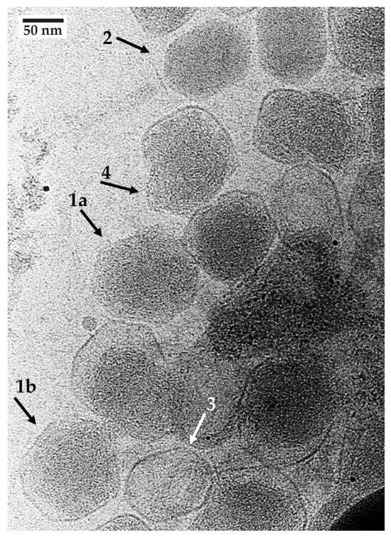 Three observations indicated that many, if not all, of the #1 arrow particles did not have broken shells. First, no sign of breakage existed, and the outer shell was thinned to 1–2 nm (e.g., particle indicated by arrow #1a in Figure 4) in relation to the ~3 nm thick shells of capsids that had lost their DNA (arrow #3 in Figure 4). Shell thinning is a necessary consequence of hyper-expansion because of the conservation of mass. Second, when DNA appeared to have been expelled, the capsid appeared unbroken (arrow #3 in Figure 4). Third, some particles had a bulge where DNA appeared to be pushing against the capsid’s shell. However, the DNA appeared to still be restrained, as though the particle’s protein shell was still present to restrain the DNA (arrow #4 in Figure 4). If the shell had broken, the DNA would have been expelled.