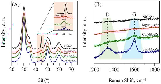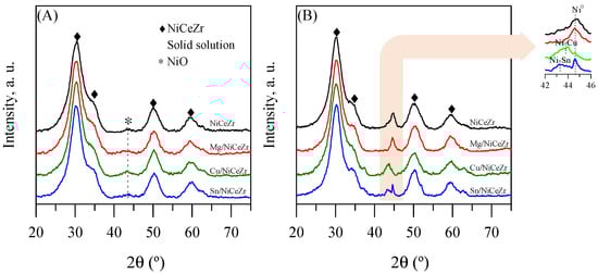 The XRD diffractograms of the calcined solids (Figure 1A) showed broad diffraction peaks, indicative of a small crystallite size. The most intense signals were attributed to the NiCeZr solid solution that crystallized in the tetragonal phase (ICDD 01-088-2398). Additionally, a barely discernible peak at 44.3°, attributed to NiO (ICDD 01-078-0643), was observed, suggesting that some of the nickel had segregated as NiO. After impregnating the promoters, no distinct peaks for MgO, CuO, or SnOX were observed, indicating their high dispersion. These results were expected since the nominal loading of the promoters was about 1/20 of the monolayer.