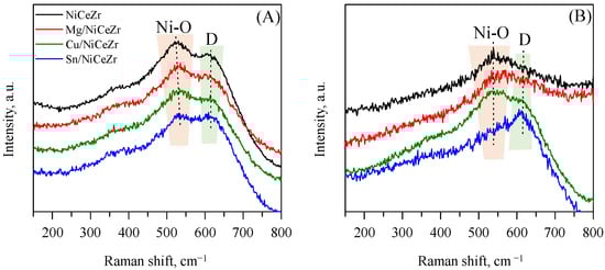 After reduction, the Raman profiles changed for all the catalysts. For example, for the base NiCeZr and Mg/NiCeZr catalysts, the D band vanished and the band from Ni-O bonds shifted to 550 cm−1. For the Cu/NiCeZr catalyst, the Ni-O band notably broadened, while it almost vanished for the Sn/NiCeZr catalyst. These solids were the only solids where the D band remained.