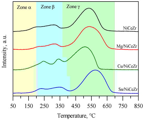 The reduction profiles of the base NiCeZr solid (Figure 3) contained three primary contributions, each corresponding to the reduction of different chemical species [,]. The contribution below 200 °C (named α-contribution) was associated with the reduction of easily reducible oxygen at oxygen vacancy sites (OV). The intermediate temperature contribution (the β-contribution) in the range between 200 and 360 °C involved the reduction of free NiO entities on the surface. Lastly, the γ-contribution, encompassing the range from the end of the β-contribution up to 800 °C, included the reduction of Ni2+ species in the solid solution, as well as of Ce4+ ions on the surface and in bulk. The reduction profile of the Mg/NiCeZr solid was similar to that of NiCeZr, the γ-peak getting broader and upshifting by 7 °C. These results suggested that the presence of Mg somewhat hindered the reduction of Ce4+ and/or Ni2+ in the ternary solution [,]. The reduction profile of the Cu/NiCeZr solid differed from that of the base NiCeZr in two main ways. Firstly, there were two well-defined peaks in the β-region, corresponding to the separated reduction of highly CuO to Cu0 (peaking at 245 °C) and NiO to Ni0 (peaking at 342 °C) [,].
