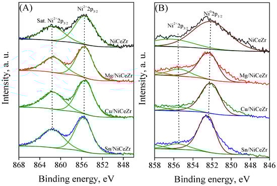 The analysis of the Ni 2p3/2 core-level spectra (Figure 4) revealed a consistent pattern, consisting of a main peak in the range of 851–859 eV and a satellite peak at around 862 eV, both indicative of the Ni2+ species []. These results confirmed that the calcined solids contained only Ni2+. The spectrum of Mg/NiCeZr was found to be identical to that of NiCeZr. However, the main peak shifted slightly towards a lower binding energy (−0.1 eV) for the Cu/NiCeZr catalyst. This shift could be associated with changes in the unfilled electronic holes of the D band, resulting from the charge transfer from Cu to the adjacent Ni []. On the other hand, the main peak shifted up by 0.2 eV for the Sn/NiCeZr catalyst, which was likely due to the higher electronegativity of Sn (1.96) compared to that of nickel (1.91) [].