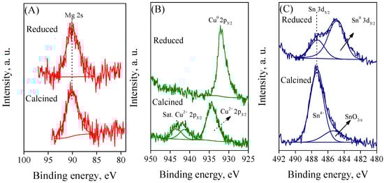 XPS spectra of Mg 2s (A), Cu 2p3/2 (B), and Sn 3d5/2 (C) in the calcined and reduced forms of Me/NiCeZr catalysts.