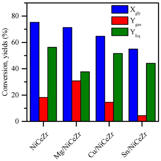 The performance of the synthesized Me/NiCeZr catalysts was evaluated for glycerol hydrogenolysis in the aqueous phase without the addition of external hydrogen. The presence of gas-phase H2 or hydrogenolysis products would imply the production of H2 by sacrificing part of the fed glycerol. The NiCeZr catalyst achieved the highest glycerol conversion rate (Figure 6), with most of the reacted carbon obtained in the liquid phase (Yliq > Ygas). The addition of any promoter resulted in lower glycerol conversion and reduced liquid yield. The type of promoter had a significant but distinct impact on both outputs. For instance, the Xgly decreased as follows: NiCeZr (75.3%) > Mg/NiCeZr (71.3%) > Cu/NiCeZr (64.7%) > Sn/NiCeZr (54.9%). However, Yliq followed the trend: NiCeZr (56.3%) > Cu/NiCeZr (51.6%) > Sn/NiCeZr (44.1%) > Mg/NiCeZr (37.6%). There was a clear correlation between the density of the acid sites (Table 2) and the percentage of Yliq in relation to the total carbon yield (Yliq + Ygas), irrespective of the glycerol conversion, in line with others [].