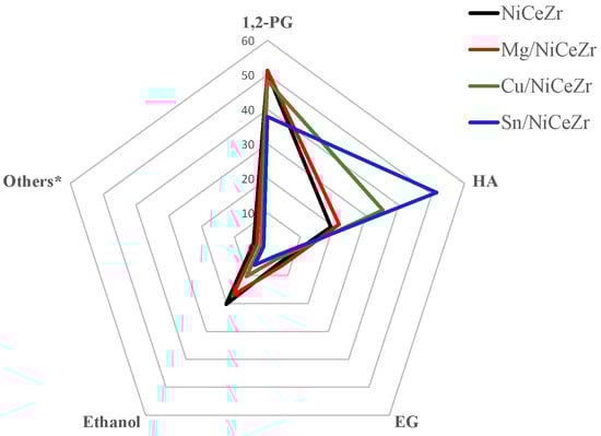 As illustrated in Figure 6, a significant portion of the carbon feed is acquired in liquid form. Figure 7 displays the selectivity towards primary liquid products. The primary liquid products obtained were 1,2-PG, HA, ethanol, and EG, which accounted for over 95% of the total. Other minor products included methanol, acetone, and 1-propanol. The highest selectivity was found for 1,2-PG, with no notable differences among them (around 50%), except for Sn/NiCeZr catalysts. However, the selectivity to 1,2-PG of Sn/NiCeZr decreased to 37.9%, at the expense of an increase in selectivity for HA. The formation of 1,2-PG (though the hydrogenation of HA) may be suppressed due to the lower density of metal sites in the catalyst. The selectivity towards HA was increased by the bimetallic Cu/NiCeZr and Sn/NiCeZr catalysts, likely due to their higher acidity that enhances HA formation by dehydrating glycerol to HA. However, the Mg/NiCeZr catalyst, which potentially has a more electronegative Ni, showed lower dehydration activity, resulting in reduced HA selectivity (21.7%). The dehydration of glycerol produces HA, which is then hydrogenated to form 1,2-PG (Scheme 1). The difference in product distribution suggests that the metallic sites in NiCeZr and Mg/NiCeZr had a higher hydrogenation capacity.