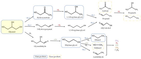 Biodiesel production is a sustainable alternative to fossil fuels that also generates glycerol, a byproduct with significant potential in sustainable chemistry due to its versatile properties that makes it an ideal raw material for a wide range of products. The valorization routes for glycerol depend on the activation and reactivity of specific bonds such as C–C, C–O, C–H, and O–H. The preferential cleavage of these bonds determines the catalyst properties and process conditions [,]. Bifunctional catalysts containing both metal and acid/basic sites are suggested as the most suitable for cleaving C–C and C–O bonds [].