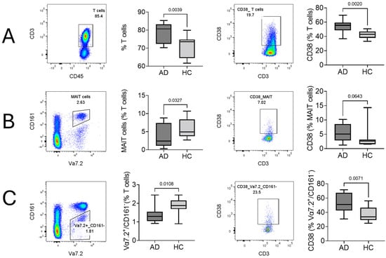 2.1. Cellular Surface Marker Characterization of T Cells, MAIT Cells, and Vα7.2+/CD161− T Cells in AD