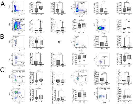 The Th2/22 dominance of T cells is a classical feature of AD, and our results also show a significantly lower percentage of Interferon γ (IFNγ) production and slightly upregulated however nonsignificant IL-4 producing T cells. A higher percentage of IL-22-producing T cells and no significant difference in IL-17A-producing T cells were found (Figure 2A). A polyfunctional double-positive Tumor Necrosis Factor α (TNF α)/Granzyme B (GzB)-producing MAIT cell subset was significantly higher in AD (Figure 2B), suggesting the involvement of PB MAIT cells in disease pathogenesis. Conversely, single-positive GzB and TNFα, along with IFNγ, did not show any significant difference. The Vα7.2+/CD161− T cell response was similar to the conventional T cells’ pattern. Th1 (IFNγ)-producing cells were decreased and slightly upregulated but with non-significant IL-4 production, and a significant upregulation of Th22 (IL-22)-producing cells was found. IL-17A-producing Vα7.2+/CD161− T cells did not show any significant difference (Figure 2C). Other intracellular markers—like IL-17A, IL-22, and IL-18Rα of MAIT cells; TNFα, GzB, TNFα/GzB, and IL-18Rα of T cells; and Vα7.2+/CD161− T cells—did not show any significant difference (Figure 2A–C).