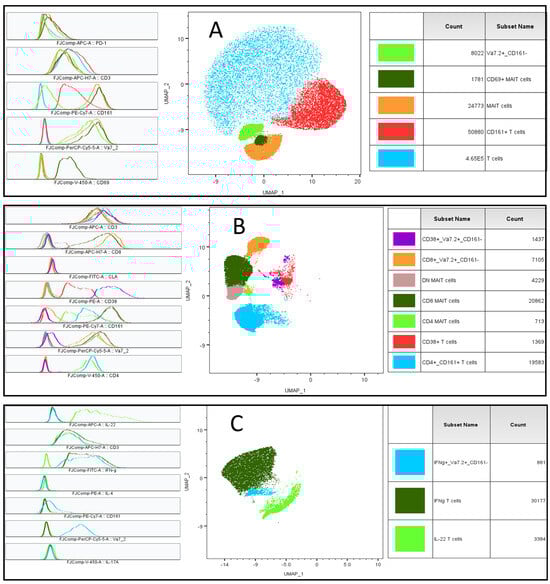 Dimensionality reduction (UMAP) and clustering (FlowSOM) of flow cytometric data are presented. T cell subsets that were significantly different between AD and HCs within tubes 1, 2, and 3 are presented in (A), (B), and (C), respectively. Middle plots show UMAP_1 and UMAP_2 plots; their phenotypes are shown in multiple overlay plots on the left side. The count of the total T cells and the names of subsets are given in the right-side panel.