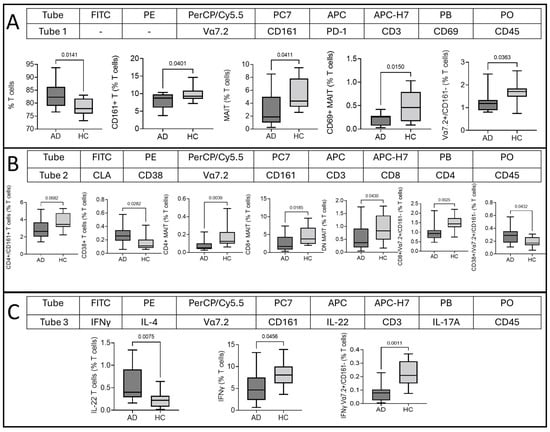 A T cell multidimensional analysis of tubes 1, 2, and 3 revealed several immune clusters that were significantly different between AD patients and healthy controls. Based on the expression of the markers in the tubes, the phenotypes of the immune clusters were determined. Overall, T cells, CD161+/T cells, Vα7.2+/CD161− T cells, MAIT cells, CD69+/MAIT cell, CD38+/T cells, CD4+/CD161+/T cells, CD8+/Vα7.2+/CD161− T cells, CD38+/Vα7.2+/CD161− T cells, CD4+/MAIT, CD8+/MAIT, DN/MAIT cells, IFNγ+/T cells, IL-22+/T cells, and IFNγ+/Vα7.2+/CD161− T cells were found to be statistically significantly different (Figure 4). There was a higher representation of CD3+ T cells and a lower representation of CD161+ T cells, MAIT cells, CD69+ MAIT cell subsets, and Vα7.2+/CD161− T cell subsets in AD than in HCs (Figure 5A). Tube 2 revealed further subsets of these cells, based on cellular surface expression. CD4+/CD161+ T cells were lower, CD38+ T cells were higher, MAIT cell subsets (CD4, CD8, and DN) were lower, CD8+/Vα7.2+/CD161− T cells were also lower, and CD38+-activated Vα7.2+/CD161− T cells were higher in AD (Figure 5B). Data from tube 3 revealed a Th2/22 response of T cells, where IL-22-producing CD3+ T cells were higher and IFNγ-producing cells were lower. IFNγ-producing Vα7.2+/CD161− T cells were also found to be suppressed in AD (Figure 5C). We did not find any significant difference in tube 4 using the multidimensional analysis.
