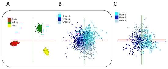 Model validation using mixed class permutations. (A) PCA-LDA score plot of a model created from 10 independent mouse kidney (442, 10-s PIRL-MS sampling events), 10 independent mouse brain (446, 10-s PIRL-MS sampling events), and 10 independent mouse liver (409, 10-s PIRL-MS sampling events) samples. The data for this model were acquired as described previously using the reported hardware [] and processed using 1/5th (20%) of the number of data points as the maximum number of PCA components (this was equal to 258 for 100% data usage). As shown here, a separate grouping of data points between classes is seen. (B) The PCA-LDA scores plot of a permuted model with mixed classes, wherein each group contains an equal representation of data from all other classes. This model does not show any separation of data, suggesting that the separation seen in the class data in panel (A) (with true class annotations) is significant. This model was processed using the same parameters that were used for panel (A). This is key. Panel (C) shows the PCA-LDA score plot of 409 data points (sampling events) from 10 independent mouse livers, analyzed in panels (A,B) and divided equally between three repetition classes, each containing 132, 138, and 139 events, respectively. This model serves as a control and shows a similar degree of mixing as what was shown for the permuted false class model of panel (A). Figure 2 shows the cross-validation statistics of these models (at 10% sample use intervals) from the 20% leave-out test and suggests 97.84%, 44%, and 51% for panel (A–C) models, respectively, at 100% data usage. For Figure (A,B) models, the maximum number of PCA components was 258. Reducing this to only 25 also resulted in cross-validation of 99.69% for (A), suggesting that when the inter-class variance is large and the intra-class variance is relatively small, way fewer than maximum (1/5th of the data) PCA component capture most of the data variance. This will be evident in the “Scree plots”. The concordance of panel (B,C)’s cross-validation statistics suggests that the permuted model bearing mixed annotations in each class effectively reports the cross-validation statistics of a dataset that is equivalent to that of multiple sampling events from the mouse liver, an organ that is highly molecularly homogeneous and bears little intra-class variability in its 10 s PIRL-MS signatures. Note that in this example, less than 50 specimens per class provided reliable performance due to large inter-class and small intra-class variance in the mass spectral data.