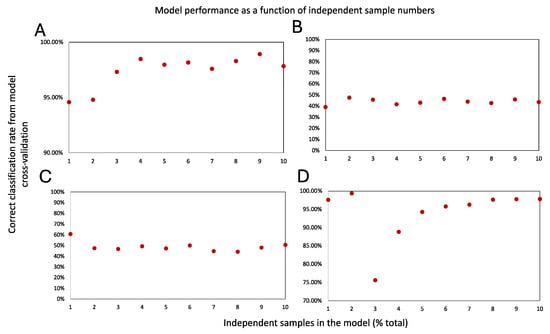 A suitable molecular model must additionally possess favorable cross-validation statistics. A survey of the suitable cross-validation methods for various models is available and must be consulted []. In our experience, however, for large and balanced datasets (e.g., containing a similar number of data points in each class) that consequently require a large number of iterations to be suitable for this approach [], and only in combination with appropriate controls such as permuted models (to address several inherent limitations []), a 20% leave-out cross-validation is a simple tool to assess a model’s robustness [,,]. This test is a variant of the “leave p-out method”, wherein 20% of the data are iteratively removed and used to test the performance of the model that is built with the remaining 80% of the data. Here, one extreme scenario is the “leave-one-out” test, in which only one data point is removed and classified against the model, which is rebuilt iteratively with the rest of the data.This is more suitable for smaller datasets. While there have been calls for leave-out tests to be avoided altogether (especially in very small test sets [,]), they constitute an easy-to-implement strategy for first-pass model validation efforts if executed correctly (with cross-validation statistics reported alongside those of a similarly sized permuted model). Further, if the model is comprised of dependent data from the same specimen (e.g., multiple sampling events from the same specimen to capture heterogeneity), it is prudent to ensure that no data points from the same specimen populate both the training and test datasets to avoid bias [,]. Here, additionally, the creation of “learning curves” that plot the model’s performance metrics (e.g., cross-validation accuracy or sensitivity and specificity) as a function of independent specimen numbers that are used in the study (in increments of 10–20% total) will help glean further insights into whether the study sample size is sufficient or not [,]. A model that contains sufficient sample numbers should show a clear saturation of the “learning curves” upon utilization of the total study sample size []. Figure 2 displays the learning curves for the models that are shown in Figure 1. As can be seen here, the learning curve associated with Figure 1A (comprised of highly molecularly distinct classes) produces 94.58% correct classification from the cross-validation statistics, even at 10% of the total data usage (Figure 2A), and a plateau is reached past 40% of the total data usage. The permutated model containing mixed classes (Figure 2B), on the other hand, never reaches this level of performance metrics. Here, the inclusion of additional mixed-class data points does not improve the cross-validation performance of the model, which remains similar to the performance of the Figure 1C model comprising datapoints from the same specimens populating all participating classes (Figure 2C). For the learning curves in Figure 2A,B we adjusted the maximum number of PCA components based on one-fifth of the data at each usage interval. This was to avoid overfitting. Figure 2D shows the overfitting of the Figure 2A learning curve, in which we used a much larger maximum PC value at each interval (see legend). As can be seen here, at lower data usages of 10% and 20% the model data are severely overfitted, producing very high cross-validation values. This is followed with a drastic drop in the cross-validation statistics over the next few data usage intervals that eventually (as a suitable number of PC is attained) recovers to reach saturation. This is why it is critically important to evaluate the overfitting in multivariate models or move to validate the model’s generalizability using an independent validation set or with permutation tests, as suggested among others.