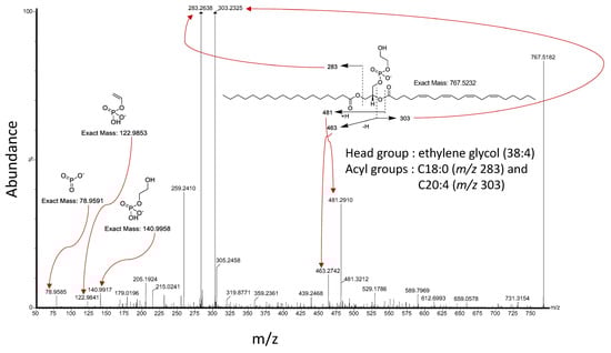 An unusual lipid with ethylene glycol headgroup seen in PIRL-MS analysis of skin cancer. This previously unreported lipid was seen in our attempt to discover biomarker ions for skin cancer type differentiation with PIRL-MS []. In this figure, we are showing the MS/MS spectrum of the parent ion m/z 767.5232, obtained from extracts made from the plume of PIRL laser collected from cancer tissue by capture on a filter paper, as described in [], and subsequently analyzed with ElectroSpray Ionization (ESI) with high-resolution mass spectrometry [] post-chromatography. Surprisingly, this ion was not seen in lipid extracts made directly from the tissue, which may further imply a role for the desorption source in its formation (pending future additional clarifying experiments to be performed). This unusual headgroup is not reported in LipidMaps [], which is routinely used by us and many other groups to verify tentative identity assignments for lipidic species.
