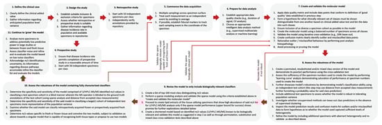 Summarizing the discussions above, Figure 4 defines the workflow for a robust design and meaningful interpretation of PIRL-MS modeling results that we deem to be relevant to investigators utilizing similar technologies for the rapid identification of biological tissues with untargeted mass spectrometry. We envision the molecular models created and validated using the guidelines that are summarized in Figure 4 to form “living documents” that require continual updates and refinement as additional knowledge regarding disease molecular pathways or tissue molecular heterogeneity at the population level surfaces, necessitating adaptations such as shortening the classifier list or adapting the standard deviation level for distance-dependent [from a cluster] classification methods. While this strategy leads to inevitable recertification of the new models by regulatory bodies, we believe that the potential improvements gained in diagnostic accuracy of such revised models may well justify the effort.