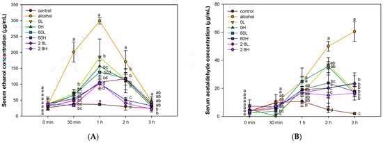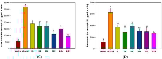 Following oral administration of 25% alcohol, the experimental animals were sacrificed sequentially at 0 min, 30 min, 60 min, 120 min, and 180 min, and blood samples were obtained from the abdominal vein. Blood samples obtained for each period were centrifuged at 13,000× g for 10 min at 4 °C, and the supernatant serum was used as an analysis sample. Serum alcohol and acetaldehyde concentrations were measured using commercial kits (Megazyme Int., Bray, Ireland). AUC was measured using the trapezoidal method (for the time interval of the obtained blood samples) [,].