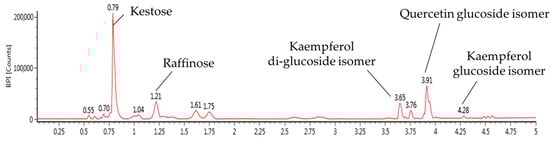 The results of identifying EA using ultra-performance liquid chromatography-quadrupole time of flight mass spectrometry (UPLC-QTOF/MSE) analysis are shown in Figure 2 and Table 1. The results of compound estimation and identification compared to MS fragments from previous studies are as follows: kestose (retention time (RT), 0.79 min and m/z, 503; 179, 341, 101, 323, 221, 113), raffinose (RT, 1.12 min and m/z 503; 341, 323, 211, 179, 143), kaempferol di-glucoside isomer (RT, 3.65 min and m/z 609; 447, 285), quercetin glucoside isomer (RT, 3.91 min and m/z 463; 301, 285, 464), kaempferol glucoside isomer (RT, 4.28 min and m/z 447; 174, 285, 229).