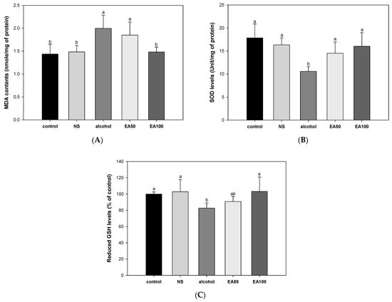 Ameliorating effect of the mixture of aqueous and 60% ethanol (2:8, w/w) extracts of Allium ochotense (EA) on the antioxidant system. (A) The malondialdehyde (MDA) contents, (B) superoxide dismutase (SOD) levels, and (C) reduced glutathione (GSH) levels. NS group, the mixture of aqueous and 60% ethanol extracts of Allium ochotense (100 mg/kg of B.W.) + drinking water; EA50 group, the mixture of aqueous and 60% ethanol extracts of Allium ochotense (50 mg/kg of B.W.) + alcohol; EA100 group, the mixture of aqueous and 60% ethanol extracts of Allium ochotense (100 mg/kg of B.W.) + alcohol. The results are shown as mean ± SD (ex vivo test, n = 7). Data were statistically considered at p < 0.05, and different lowercase letters indicate statistical differences.